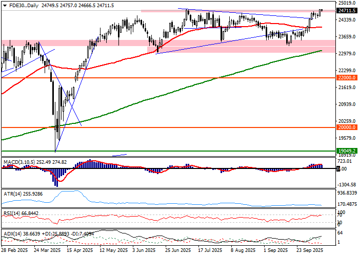 Sesja środowa na rynku niemieckim skończyła się zwyżką DAX-a o 0,87 procent. Bilansem było zbliżenie się do najwyższego poziomu w historii w perspektywie intraday, który pozostaje niepokonany od pierwszych sesji lipca. Niemniej, na poziomie zamknięcia dnia DAX wyznaczył nowe ATH. Spojrzenie na wykres CFD pozwala odnotować, iż sesja miała element wybicia z mikrokonsolidacji, która była grana po zeszłotygodniowej fali wzrostowej. Wykres wskazuje, iż rynek mógł wejść w trzecią fazę klasycznego układu ruch-konsolidacja-ruch, który zapowiada wybicie na nowe ATH. Niemniej, stale za wcześnie przesądzać, iż konfrontacja z górnym ograniczeniem kilkumiesięcznej konsolidacji skończyła się pokonaniem oporów i zbudowaniem potencjału zwyżki o szerokości około 2000 punktów, a więc w rejon 27000-26500 pkt. Dodatkowo, rynek cały czas konfrontuje się z rejonem 25000-24500 pkt. w kontekście dywergencji wskaźników z wykresami indeksu i kontraktów oraz przy położeniach oscylatorów, które ostrzegają przed pułapką hossy. W praktyce, technicy odpowiadający na potencjalne ciągle wybicie z konsolidacji będą grali z blisko stawianymi zleceniami obronnymi. Analogicznie zachowają się, gracze próbujący sprzedać opory w rejonie 25000-24500 pkt., którzy będą operowali z szybko realizowanymi zleceniami stop-loss.