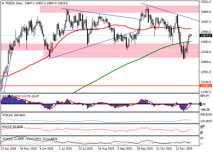 Sesja czwartkowa na rynku niemieckim skończyła się zwyżką DAX-a o 0,18 procent. Sesja o skromnej zmienności, jakie zwykle są grane w trakcie świąt w USA, nie przeszkodziła powiększyć zwyżki w bieżącym tygodniu do 2,95 procent i zredukować listopadową stratę do 0,74 procent. Uwzględniając zmienność, rynek nie jest bez szans na zmianę miesiąca na wzrostowy. Na chwilę obecną jednak futures wskazują, iż rynek kasowy przedłuży wczorajszą konsolidację. O obrazie technicznym przesadzają poprzednie sesje tygodnia. Rynek pozostaje pod wpływem lokalnego impulsu wzrostowego budowanego na obronie wsparć na dolnym ograniczeniu konsolidacji i granicy półrocznego trendu bocznego. Technicy odnotują powrót wykresu nad średnią z 200 sesji, której przełamanie było ostrzeżeniem przed zmianą momentum na spadkowe. W przypadku indeksu bazowego popytowi udało się też zanegować przebicie wparć w rejonie 23050-23000 pkt. i faktyczne odwrócić wybicie z konsolidacji, której symbolicznymi granicami pozostają rejony 25000 pkt. na północy i 23000 pkt. na południu. W klasycznym odczytaniu, po fałszywym wybiciu rynek ma szansę na przetestowanie górnego ograniczenia konsolidacji, ale stale na układy na wykresach lepiej patrzeć przez pryzmat aktualności trendu bocznego. W istocie, fałszywe wybicie z konsolidacji i odbicie się wykresów od strefy 23000 pkt. było oczekiwane, gdyż wyprzedanie rynku zachęcało popyt do kontry i dopiero kolejne sesje pokażą, co popyt zdoła zbudować na obronie dolnego ograniczenia wielomiesięcznej konsolidacji. Niemniej, szanse na powrót do środka konsolidacji i spotkanie ze średnią z 50 sesji w roli oporu można uznawać za scenariusz bazowy. W praktyce byłby to powrót do położenia neutralnego technicznie.