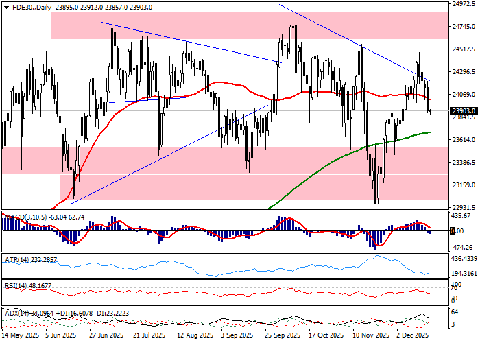 Sesja środowa na rynku niemieckim skończyła się spadkiem DAX-a o 0,48 procent, ale centralnym punktem rozdania był dryf w rejonie psychologicznego poziomu 24000 pkt. Notowania czwartkowe pochodnych wskazują, iż rynek nie traci kontaktu z poziomem, który można uznać za środek trendu bocznego. W efekcie, obraz techniczny pozostał bez zmian. Obserwowany ostatnio powrót w rejon 24000 pkt. oznacza, iż rynek jest znów w połowie drogi między górnym ograniczeniem konsolidacji w strefie 25000 pkt. i dolnym w rejonie 23000 pkt. W efekcie, rynek ma stale przed sobą temat wybicia z konsolidacji, bez którego nie będzie przesilenia w oswojonych i aktualnych trendach bocznych. Zachowanie rynku nie zaskakuje, gdy uwzględni się przebiegi średnich z 50 sesji i 200 sesji, którym coraz bliżej do solidarnego wypłaszczenia, co wzmacnia trend boczny i sygnalizuje neutralność momentum. Wskaźnikom również najbliżej do neutralności, co dodatkowo wzmacnia obraz rynku zawieszonego w półrocznym trendzie bocznym i sumuje się w znany przymus czekania na przesilenie lub chociażby test granic konsolidacji.