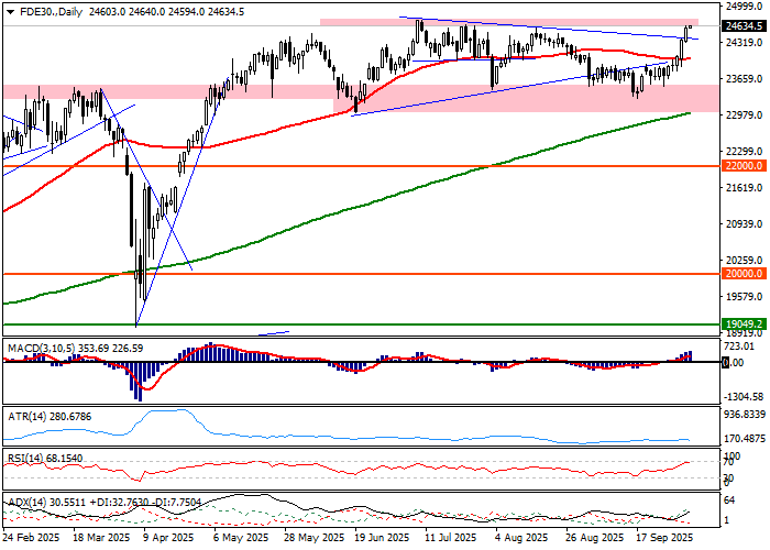 Niemiecki DAX skończył sesję czwartkową zwyżką o 1,28 procent i przedłużył wzrostową serię na piąty dzień z rzędu. Ostatni raz taki ciąg zwyżek miał miejsce w maju, więc w okresie, który poprzedził letnią konsolidację. Pochodną okazanej siły rynku jest zwyżka w perspektywie tygodniowej o 2,97 procent, co na chwilę obecną przekłada się na najlepszy tydzień DAX-a od połowy sierpnia. Notowania piątkowe kontraktów poprawiają ten obraz powiększeniem tygodniowej zwyżki do przeszło 3,2 procent, co oznacza, iż pochodna jest w grze o najlepszy tydzień od początku maja. Efekty widać na wykresie CFD, który kończy tydzień połamaniem oporów w rejonie 24000 pkt., gdzie średnia z 50 sesji i dolne ograniczenie trójkąta tworzyły barierę podażową. W istocie, wykres połamał też górne ograniczenie trójkąta i testuje strefę oporów, która stanowi górne ograniczenie letniej konsolidacji. W praktyce, kontrakt zapowiada atak DAX-a na kluczowy opór w rejonie 25000 pkt. Niestety, wskaźniki sygnalizują, iż konfrontacja z 25000 pkt. będzie miała miejsca w kontekście ostrzeżeń przed lokalnym wykupieniem rynku. W praktyce, odpowiedź na potencjalne ciągle wybicie z konsolidacji będzie grana z blisko stawianymi zleceniami obronnymi, które uchronią przed pułapką hossy. Niemniej, próbujący sprzedać opór na 25000 pkt. będą liczyli się z ryzykiem zbudowania potencjału zwyżki równemu szerokości letniej konsolidacji, co oznacza możliwość ruch w rejon 27000 pkt.