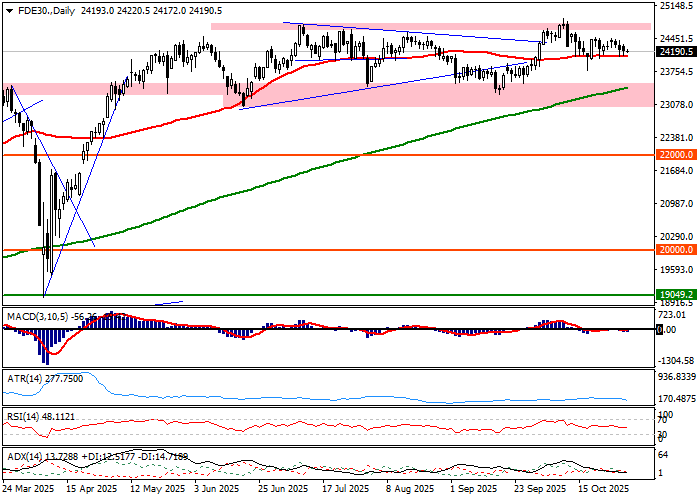 Niemiecki DAX skończył sesję czwartkową spadkiem o 0,02 procent, gdy notowania piątkowe kontraktów przynoszą równie kosmetyczną zmianę. W efekcie, pochodna na niemiecki indeks notuje spadek w perspektywie tygodniowej o około 0,6 procent, gdy indeks bazowy oddaje 0,4 procent. Całość sumuje się w obraz rynku zawieszonego w półrocznej konsolidacji i wpisuje w szerszą perspektywę, którą jest październikowa zwyżka indeksu o ledwie 1,1 procent. Spojrzenie na wykres CFD pozwala odnotować, iż ruchy rynku mieszczą się w obserwowanym ostatnio dryfie kontraktów w konsolidacji w rejonie 24300-24250 pkt., co ma swój odpowiednik na wykresie indeksu. Lokalna perspektywa techniczna pozostaje zdominowana przez odbicie się rynku od średniej z 50 sesji w roli wsparcia. W szerszej perspektywie patrząc wykresy pozostają w okolicy 24000 pkt., co oznacza, iż rynki kasowy i pochodnych wróciły do środka konsolidacji granych przez kilka ostatnich miesięcy. Zmiana tego układu wymaga wybicia poza półkę, której symbolicznymi granicami są okolice 25000 pkt. i 23000 pkt. Wskaźniki prezentują się neutralne i nie tylko potwierdzają siłę trendu bocznego, ale też nie dają przewagi żadnej stronie rynku i wzmacniają trend boczny. Całość sumuje się w aktualny od dłuższego czasu przymus czekania na policzenie się podaży z popytem na jednej z granic konsolidacji. Uwzględniając zmienność mierzoną wskaźnikiem ATR z 14 sesji – w okolicy 280 pkt. – należy zakładać, iż czekanie na przesilenie przeniesie się na pierwsze sesje listopada.