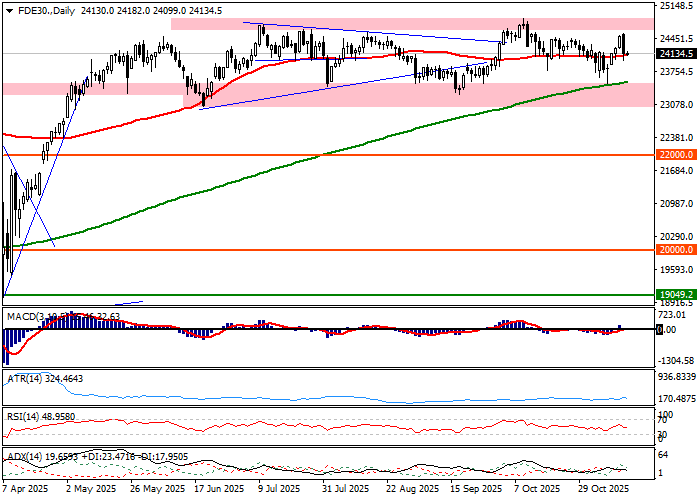 Niemiecki DAX skończył sesję czwartkową cofnięciem o 1,39 procent, co przekłada się na największy spadek procentowy od 17 października. Niemniej, w bieżącym tygodniu indeks stale rośnie o przeszło 2 procent, więc popyt nie jest bez szans w grze o utrzymanie pozytywnego wyniku w tej perspektywie czasowej. Spojrzenie na wykres CFD pozwala odnotować, iż sesja wczorajsza przesądza jednak o zakończeniu tygodnia w konsolidacji. Powrót do środka trendu bocznego, który od pół roku mrozi rynek w swoich granicach oznacza, iż zmienność mierzona wskaźnikiem ATR z 14 sesji jest za mała, by doszło dziś do kolejnego testowania granic układu. W istocie, szerokość konsolidacji wynosi około 5 procent wartości indeksu – tygodniowe przesunięcie o więcej niż 2,5 procent miało ostatni raz miejsce na początku sierpnia - więc rynek ma znów sporo przestrzeni do ruchów bez przesilenia. Inaczej mówiąc, położenie bliskie środka układu sprzyja braku nowych sygnałów technicznych. Średniookresowo gra odbywa się w znany od kilku miesięcy trendzie bocznym, co potwierdza nie tylko położenie wykresu na tle oporów i wsparć, ale też układ na podstawowych wskaźnikach. Całość sumuje się w znany od tygodni przymus czekania na zakończenie kilkumiesięcznej konsolidacji, której symbolicznymi granicami są okolice 25000 pkt. i 23000 pkt.