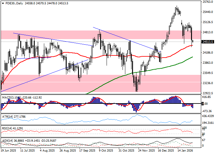 Sesja czwartkowa na rynku niemieckim skończyła się spadkiem DAX-a o 2,07 procent, co przekłada się na największy dzienny spadek procentowy od wielu miesięcy. Efektem jest też powiększenie straty w bieżącym tygodniu do 2,28 procent, co dowiezione do finału sesji piątkowej przełożyłoby się na najgorszy tydzień indeksu od listopada 2025 roku. Wczorajsza słabość rynku powoduje też, iż styczniowa zmiana indeksu wynosi teraz -0,74 procent, więc pojawia się ryzyko otwarcia nowego roku miesiącem przeceny, co będzie wyzwalało pytania o szanse byków w całym roku. Technicznie patrząc, spadek komplikuje sytuację na wykresach indeksu i pochodnych, gdyż oznacza przełamanie wsparć na górnym ograniczeniu połamanej konsolidacji. Popyt przegrał grę o wygaszenie korekty w ważnym punkcie i konsekwencją może być test dolnego ograniczenia dawnej konsolidacji oraz spadki indeksu oraz pochodnych w okolice 23000 pkt. Technicy odnotują, iż popyt próbuje kontrować na wsparciu tworzonym przez średnią z 50 sesji, więc na chwilę obecną za wcześnie przesądzać, iż czwartkowy spadek zmieni też obraz momentum, które czytane przez relację wykresów ze średnimi z 50 i 200 sesji pozostaje wzrostowe.