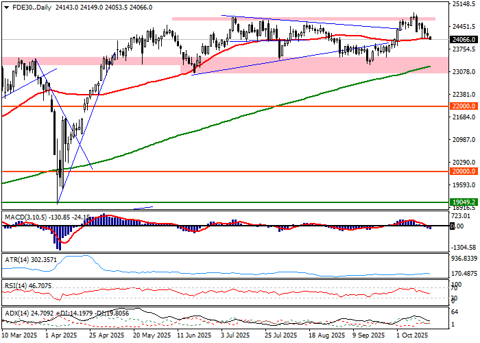 Sesja czwartkowa na rynku niemieckim skończyła się wzrostem DAX-a o 0,38 procent, ale notowania pochodnych wskazują, iż zwyżka zostanie w całości zniesiona spadkiem na otwarciu notowań piątkowych. Futures sygnalizują dość dynamiczne tąpnięcie, które zapowiada zmianę neutralnego tygodnia na spadkowy. Futures na DAX-a grane są teraz na poziomie najniższym w kończącym się dziś tygodniu, co oznacza, iż DAX może spaść pod broniony ostatnio poziom 24000 pkt. Konsekwencje oddaje wykres CFD, który testuje właśnie średnią z 50 sesji w roli wsparcia. Przełamanie 24000 pkt. przez indeks bazowy będzie oznaczało, iż rośnie ryzyko szybkiego spadku w rejony 23800 pkt. oraz 23300 pkt. Pochodną byłoby oddalenie szans byków na szybki powrót do gry na górnym ograniczeniu wielomiesięcznej konsolidacji w strefie 25000-23000 pkt. Zejście na południe skończy też – przynajmniej czasowo – grę o wybicie z konsolidacji górą i zbudowanie potencjału zwyżki o szerokość układu, a więc w rejon 27000-26500 pkt. Pozytywem cofnięcia będzie dalsze chłodzenie wskaźników, które sprzyjają podtrzymaniu zawieszenia rynku w konsolidacji granej przez pięć ostatnich miesięcy.
