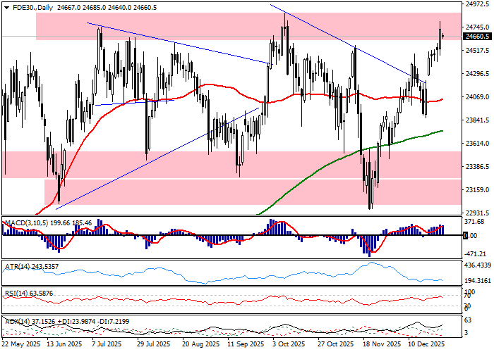 Niemiecki DAX wróci dziś do gry po dwóch dniach przerwy oraz skróconej sesji 30 grudnia, która skończyła się zwyżką indeksu o 0,57 procent. Zamknięcie wypadło ledwie 1,15 procent od rekordu hossy i ATH. Indeks rośnie też w perspektywie tygodniowej o 0,63 procent i jest w grze o szósty wzrostowy tydzień w serii. Kontrakty wskazują jednak, iż nowy rok może zacząć się od uwzględnienia w cenach nieco słabszej od oczekiwań końcówki roku na Wall Street. Również obraz techniczny wskazuje, iż rynek wejdzie w styczeń w graniach konsolidacji granej w drugiej połowie 2025 roku. Na wykresach indeksów i kontraktów stale dominują konsolidacje ograniczane oporami w strefie 25000 pkt. i wsparciami w rejonie 23000 pkt. W efekcie, rynek ma przed sobą temat wybicia z konsolidacji, bez którego nie będzie przesilenia w oswojonych i aktualnych trendach bocznych. Zachowanie rynku nie zaskakuje, gdy uwzględni się przebiegi średnich z 50 sesji i 200 sesji, którym coraz bliżej do solidarnego wypłaszczenia, co wzmacnia trend boczny i sygnalizuje neutralność momentum. Układ sił sumuje się w znany od tygodni przymus czekania na przesilenie lub chociażby test granic konsolidacji.
