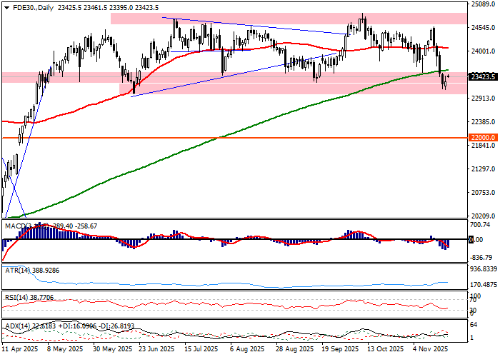 Niemiecki DAX skończył sesję środową spadkiem o 0,08 procent. Częścią sesji było jednak zejście w rejon 23085 pkt., co oznacza nie tylko wyznaczenie nowego dołka korekty – i jej powiększenie w perspektywie intraday do 6,7 procent – ale też bezpośrednią konfrontację z dolnym ograniczeniem kilkumiesięcznej konsolidacji, które zalega w rejonie 23052 pkt. Wykres CFD pokazuje, iż rynek odbił się od wsparcia, a dzisiejsza luka idealnie uzupełnia się z obroną wsparć w okolicy 23000 pkt. Popyt nie jest zatem bez szans w grze o zbudowanie odbicia na wsparciach na dolnym ograniczeniu trendu bocznego. Wskaźniki są dobrze schłodzone i potencjał spadku pod 23000 pkt. bez jakiegoś odbicia jawi się jako niski. Niestety, wykres CFD pokazuje również, iż cena pozostaje pod średnią z 200 sesji, co oznacza, iż sygnał zmiany momentum na negatywne jest aktualny. Dlatego łapacze dołka w rejonie 23000 pkt. będą operowali z blisko stawianymi zleceniami obronnymi, które uchronią przed stale obecnym ryzykiem przebicia wsparć w rejonie 23000 pkt. i zbudowaniem potencjału spadku o szerokość konsolidacji 25000-23000 pkt., a więc w rejon 22000 pkt., a nawet 21000 pkt.