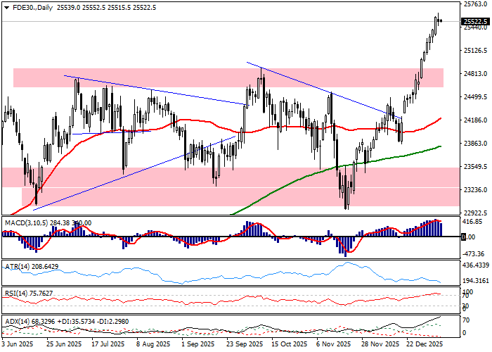 Sesja wtorkowa skończyła się kosmetyczną zwyżka DAX-a o 0,06 procent. Skromny wzrost powiększył jednak zwyżkę w bieżącym tygodniu do 0,61 procent, co przekłada się też na układ, w którym DAX jest w grze o ósmy wzrostowy tydzień w serii. Spojrzenie na wykres CFD pozwala odnotować, iż handel ma charakter jednokierunkowy. W istocie, w perspektywie dziennej zwyżka DAX-a została wczoraj przedłużona na jedenastą sesję w serii i powiększyła falę wzrostową od listopadowego dołka do przeszło 11 procent. Konsekwencją muszą być sygnały wykupienia rynku na wskaźnikach i wzrost ryzyka realizacji zysków i korekty. Technicznie patrząc zachowanie rynku wpisuje się jednak w kreślenie nowych rekordów hossy i nowych ATH oraz zameldowanie się DAX nad psychologiczną barierą 25000 pkt. Efektem jest wybicie wykresu górą z konsolidacji granej w drugiej połowie 2025 roku. Indeks wybił się górą z układu, którego szerokość sygnalizuje zbudowanie potencjału zwyżki o około 1700 pkt. W praktyce oznacza to możliwość zbudowania fali wzrostowej w rejon 26500 pkt., ale uwzględniając szybowanie rynku na ATH, rolę oporów technicznych przejmują poziomy psychologiczne. W tym kontekście połamanie 25000 pkt. oznacza przesunięcie uwagi na 25500 pkt. i 26000 pkt., gdy szerokość oraz długość konsolidacji wraz z momentum zachęcają do spoglądania na poziomy znacznie wyższe niż grany teraz poziom 25500 pkt.
