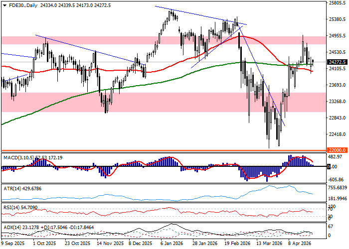 Sesja czwartkowa na rynku niemieckim skończyła się spadkiem DAX-a o 0,16 procent, gdy notowania piątkowe przynoszą cofnięcie kontraktów o 0,2 procent. Cofnięcia wpisują się w spadkowy tydzień, w którym DAX i kontrakty tracą po przeszło 2 procent. Niemniej, skromne zmiany w końcówce tygodnia wpisują się w układ techniczny, w którym dominuje korygowanie trzytygodniowej serii zwyżek. Z perspektywy technicznej można mówić o stale aktualnym impulsie spadkowym zbudowanym na kontrze podaży na górnym ograniczeniu trendu bocznego, który stał się ponownie aktualny po trzech tygodniach zwyżek. W układ wpisuje się flirt rynku ze średnimi z 50 i 200 sesji, które przybierają coraz bardziej płaski przebieg i zdają się negować ostrzeżenie związane z przecięciem MA200 przez MA50. W istocie, średnie działają w roli wsparcia. W szerszej perspektywie patrząc DAX grany w rejonie 24000 pkt. lokuje się w środku trendu bocznego i dopiero wybicia poza 25000 pkt. lub 23000 pkt. będą niosły szanse na przesilenie o średniookresowym znaczeniu. Na chwilę obecną rynek gra na poziomach neutralnych.