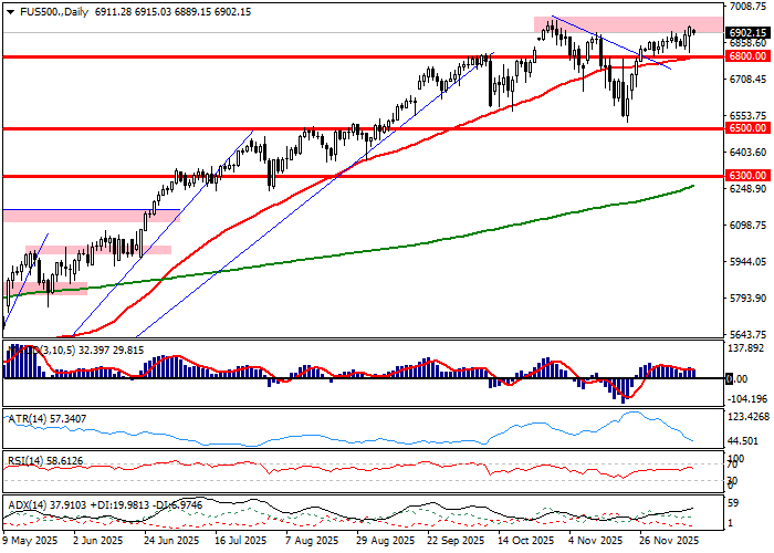 S&P500 skończył sesję czwartkową zwyżką o 0,21 procent. Efektem technicznym było wyjście nad psychologiczny poziom 6900 pkt., co oznacza też nowy rekord hossy w perspektywie zamknięcia dnia. Notowania piątkowe korygują zwyżkę spadkiem kontraktu o 0,4 procent i w perspektywie tygodniowej pochodna notuje zwyżkę o ledwie 0,2 procent. Z perspektywy technicznej stale można mówić o braku zmiany. Wykres CFD pokazuje, iż pochodna jest w kontakcie z rekordami hossy i ATH, ale bez przesilenia w kluczowym punkcie wykresu. W praktyce, rynek konsoliduje pod oporami w strefie 6950 pkt. dla kontraktów i 6920 pkt. dla indeksu. Dla techników ważna jest również wrażliwość rynku na równe poziomy, gdyż wybicie na nowe ATH będzie oznaczało konfrontację z rejonem 7000 pkt. Wskaźnikowo popyt nie jest bez szans w ataku na barierę 7000 pkt., ale w bliskim terminie warto liczyć się z większą zmiennością i z większym szumem technicznym, które będą generowały ciągle obecne reakcje rynku na sygnały z Fed oraz pozycjonowanie się graczy pod grudniowe rozliczenia pochodnych oraz rajd Świętego Mikołaja.