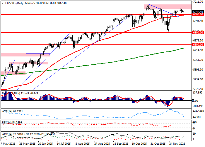 S&P500 skończył sesję wtorkową spadkiem o 0,09 procent i wpisał się w poniedziałkowy spadek o 0,35 procent. Skromne zmiany indeksu na dwóch pierwszych sesjach tygodnia wpisują się w lokalną konsolidację, która grana była już w końcówce tygodnia poprzedniego. Wykres CFD pokazuje, iż notowania środowe pochodnych wpisują się w ten układ przedłużeniem kilkudniowego zawieszenia. Szerszy obraz pozostaje zdominowany przez falę wzrostową z finałowych sesji listopada, która wyniosła wykres w rejony, gdzie rolę oporów grają szczyty hossy i ATH. Efektem jest konsolidacja pod oporami, która narzuca czekanie na wynik konfrontacji rynku z kluczowymi barierami. Dla techników ważna jest również wrażliwość rynku na równe poziomy, gdyż wybicie na nowe ATH będzie oznaczało konfrontację z rejonem 7000 pkt. Wskaźnikowo popyt nie jest bez szans w ataku na barierę 7000 pkt., ale w bliskim terminie warto liczyć się z większą zmiennością generowaną przez reakcje inwestorów na sygnały z Fed i w konsekwencji z większym szumem technicznym.