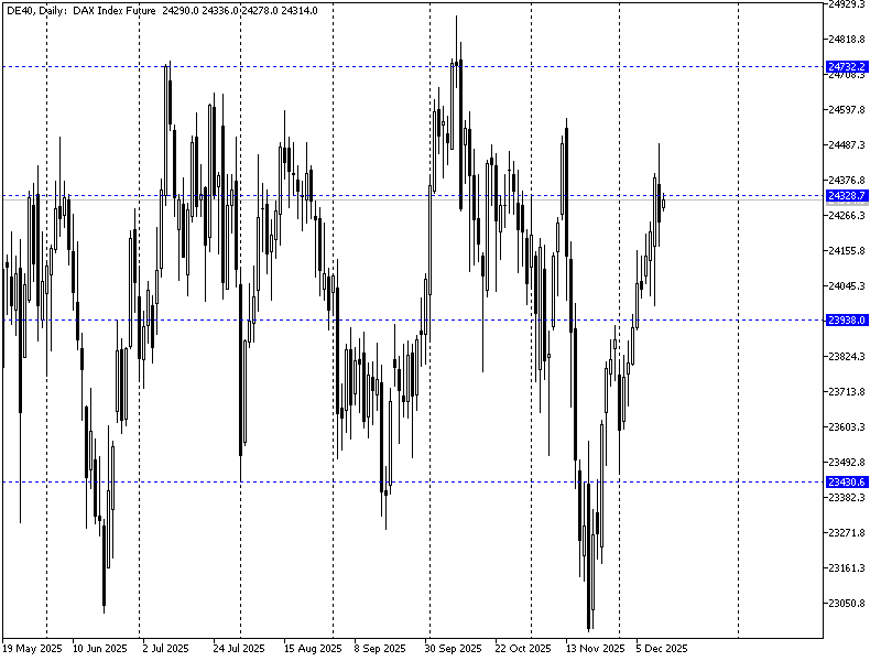 Futures na DAX'a sygnalizują otwarcie rynku kasowego nieznacznie wyżej wobec piątkowego zamknięcia (rzędu +0,4%). Rynek pozostaje w ramach szerszej konsolidacji 23k – 24 700 pkt, sygnalizując ostatnio próby podejścia pod górne ograniczenie i zakończenie roku z próba ustanowienia nowego ATH. Bieżący tydzień mijać będzie pod znakiem posiedzeniem banków centralnych, danych makro z USA (również zaległych). Ponadto trwa lekkie schłodzenie wokół sektora AI w USA (Oracle i Broadcom).