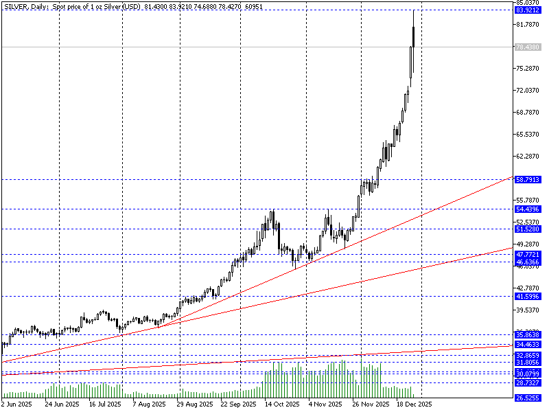 Notowania futures opartych o srebro spot wyznaczyły ATH w rejonie 83,9 USD. Z punktu widzenia statystycznego „metal szlachetny” zrobił już ok 170% w ujęciu YTD, podczas gdy ponad 100% to ruch tylko z ostatnich 5miesięcy. Depesze agencyjne wskazują za popytem na szeroki koszyk metal szlachetnych (srebro, złoto, platyna) stoją oczekiwania na dalsze luzowanie ze strony Fed w 2026, tym bardziej iż prognozy wskazują na wskazanie bardziej gołębiego szefa instytucji przez Trumpa (jako następcy Powella). Z rynkowego punktu widzenia notowania Silver weszły w klasyczną fazę hiperboli utrudniającą wskazywanie poziomów technicznych, gdyż mocniejsze wsparcie widnieje w zasadzie w okolicach 54,43-58,8 USD, podczas gdy w zakresie kolejnych 20 USD wyżej możemy mówić o lokalnych wsparciach wynikających z przebiegu handlu (np. luki D1) przy rajdzie w górę.