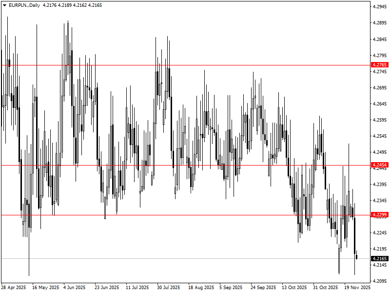 Wydarzeniem ostatnich godzin na rynkach jest zainicjowanie i zgoda Ukrainy na zaprezentowany plan pokojowy. USA rozesłała swoich przedstawicieli negocjacyjnych do Ukrainy i Rosji, gdzie wstępne sugestie medialne wskazują ze Rosja może odrzucić dokument w obecnym kształcie. Ponadto drugim, głównym tematem jest wzrost oczekiwań co do obniżek stop procentowych w USA w grudniu, gdzie aktualne szanse wskazywane są na ponad 80%. Lokalnie wydaje się iż obserwujemy lekka aprecjacje złotego pod scenariuszu pokoju na Ukrainie.
