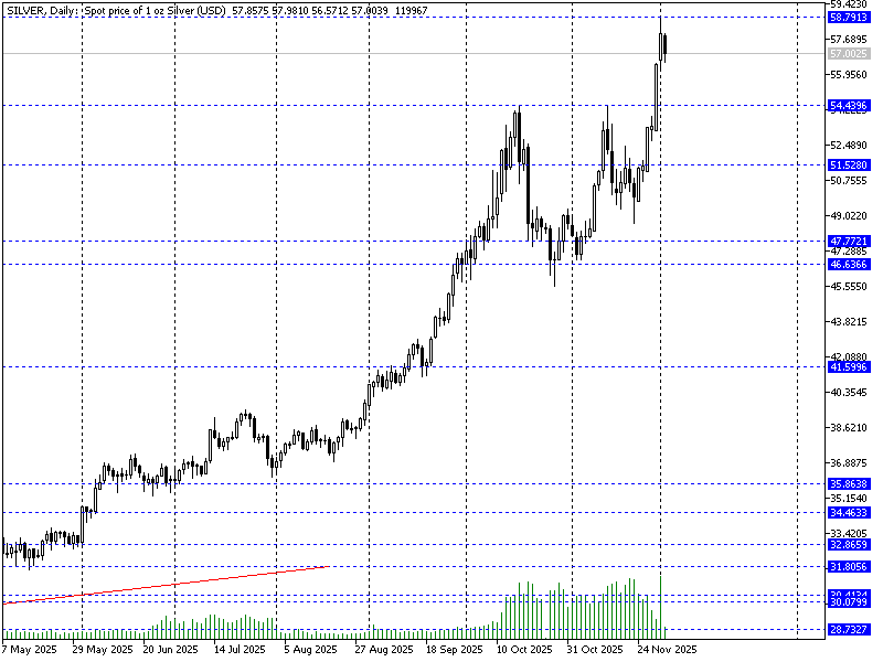 Kwotowania futures opartych o spot notowań srebra wyznaczyły wczoraj maksima w rejonie 58,80 USD. Dziś obserwujemy lekki ruch powrotny na wykresie, gdzie istotniejsze wsparcie znajduje się w rejonie 54,44 USD. Od początku roku możemy mówić o impulsie wzrostowym z okolic 28,73 USD do obecnych 57 USD. Srebro docelowo ruszyło za notowaniami złota (i innych metali szlachetnych), a perspektywy grudniowej obniżki stóp tylko wspierają nastroje na rynku surowców.