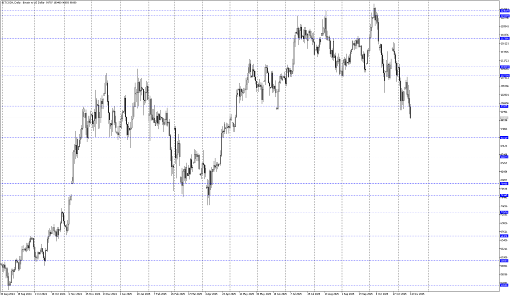 Kwotowania głównej kryptowaluty pozostają pod presją. Kolejne poziomy konsolidacyjne zostają wybijane przez wsparcia. Wpierw kurs starał się stabilizować przy 107800 USD, następnie przy pełnym zakresie 100k USD. Aktualnie podaż inicjuje zejście niżej testując 96 700 USD. Kolejna strefa popytu to okolice 91-91 800 USD.