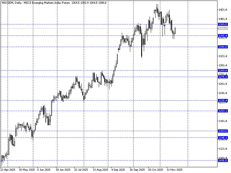 Lepsze wyniki Nvidii wsparły rynkowe nastroje, pozwalając na korektę wzrostową ostatnich przecen. Futures na MSCI EM odbijają od wspomnianego już wsparcia 1365 pkt. Wyższe otwarcia skutkują jednak lekką realizacją zysków. Opór widnieje w rejonie 1390 pkt. Rynek pozostaje jednak w trybie „ostrożności” pod wpływem spadających oczekiwań co do grudniowej obniżki Fed.