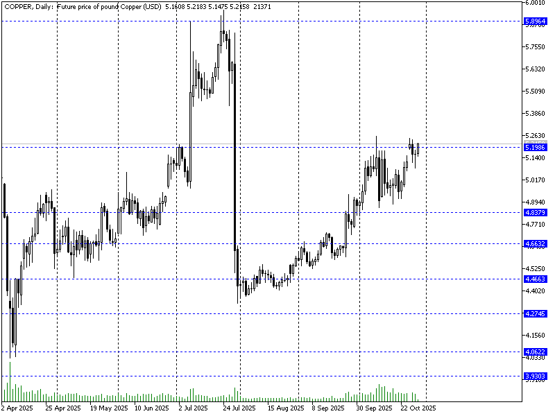 Futures oparte o miedź spot notują okolice 5.20 USD, sygnalizując ponowną chęć wybicia. Rynek liczy na umowę handlową Chiny – USA, która mogłaby się wydarzyć już w najbliższy czwartek. Dodatkowo w tle trwa wyczekiwanie na decyzję Fed, gdzie niższe stopy procentowe zwyczajowo pozytywnie wpływają na rynek surowcowy. Ponadto działają czynniki specyficzne – producent Anglo American podał 9% spadek produkcji miedzi w pierwszych 9 miesiącach 2025. Po okresie zawirowń rynkowych związanych z cłami Trumpa dot. miedzi kurs ponownie sugeruje chęć ruchu na północ.