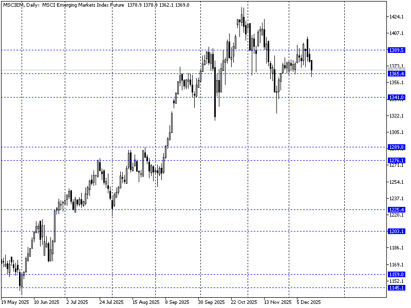 Futures oparte o MSCI EM pozostają pod presją, pomimo prób odbicia na szerokim rynku po publikacji danych z USA. Publikacje zaległych NFP (oraz najwyższe wskazanie bezrobocia od 2021) przyniosły podbicie zmienności na rynku. W praktyce nie doszło do jednak zmiany oczekiwań wobec obniżek w 2026, gdzie inwestorzy obecnie szacują ok. 2 obniżek stóp. Akualnie trwa wygaszanie reakcji na dane (podbicia eurodolara oraz zwyżki futures na SPX). W przypadku MSCI EM testujemy okolice wsparcia na 1365 pkt., co pozostaje potencjał RGR uformowanego nad wsparciem 1340 pkt.