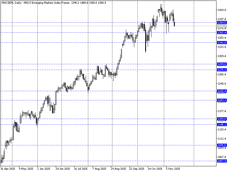 Piątek przynosi podtrzymanie wczorajszej presji podażowej na rynkach akcyjnych. Jako główny powód wskazywane jest ograniczenie szans (do 50%) grudniowej obniżki Fed. Spadają futures na Wall Street ciągnąc za sobą również gorszy sentyment wokół rynków wschodzących – pochodne na MSCI EM notują 1380 pkt, ponownie sugerując test okolic 1365 pkt. Pamiętać należy również o wysokiej korelacji MSCI z WIG20.