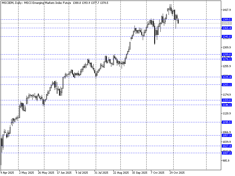 Pierwszy tydzień listopada na giełdach przynosi impuls ze strony podaży. Wyniki spółek z Wall Street podbiły zmienność, a inwestorzy ponownie poddają w wątpliwość wycen i perspektyw monetyzacji AI. Futures oparty o MSCI EM notuje spadek do okolic 1380 pkt., podbijając podaż m.in. wokół GPW. Najbliższe wsparcie to okolice 1365 pkt.