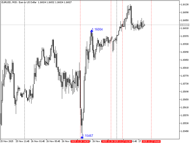 Sesja Amerykańska: W trakcie handlu w USA eurodolar zanotował podbicie zmienności – wpierw testując okolice 1,15467 USD, a następnie 1,16 USD. Rynek dyskontuje scenariusz obniżki stóp przez Fed w grudniu. Ponadto obserwowaliśmy reakcję na wydarzenia w Waszyngtonie (zastrzelenie dwóch przedstawicieli gwardii).