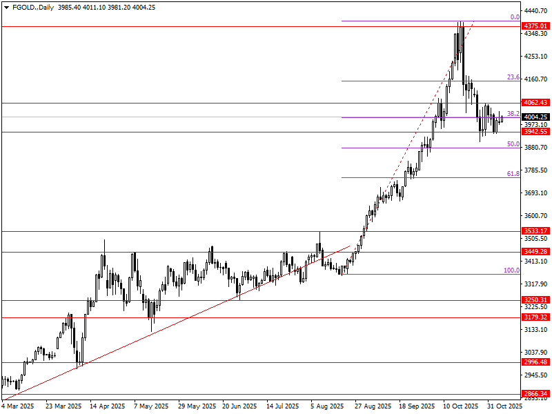 Notowania futures opartych o złoto spot pozostają w okolicy pełnego zakresu 4000 USD. Spadki z okolic 4400 USD zostały ustabilizowane jednak brak jest również impetu dla mocniejszego odbicia. W ujęciu technicznym pozostajemy w trendzie wzrostowy, dodatkowo wzmacnianym tu 50% zniesienia fibo. Ewentualna próba podejścia pod niedawna szczyty musiałaby wynikać z wybicia z aktualnej konsolidacji 3942-4062 USD.