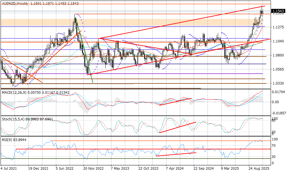 W ubiegłym tygodniu para AUDNZD odnotowała maksima w silnym trendzie wzrostowym zainicjowanym w kwietniu b.r. Poziom 1,1635 to też rejony nie notowane od 2013 r., a technicznie mogące też świadczyć o tym, że AUDNZD wychodzi z trwającej 11 lat konsolidacji. Jednak perspektywy dalszych wzrostów nie są tu tak oczywiste, a argumentem za tezą o zmianie trendu są niuanse związane z kształtem polityk monetarnych prowadzonych przez RBA i RBNZ. Australijczycy długo zwlekali z cięciem stóp, pierwszy ruch miał miejsce w maju, a drugi w sierpniu - łącznie w tym roku skala luzowania wyniosła 50 punktów baz. Obniżki miały miejsce przy utrzymującej się cały czas ostrożnej narracji w temacie inflacji, która pozostawała wysoka. Dane makro, jakie pojawiły się we wrześniu pokazały, że na kolejne ruchy na stopach trzeba będzie nieco zaczekać - podwyższona inflacja może utrzymać się nawet do połowy 2026 r., na co wskazał RBA w swoich projekcjach. Jednocześnie jednak decydenci unikali nazbyt "jastrzębiego" podejścia, podkreślając, że po stronie ryzyk jest zwłaszcza kwestia utrzymania tempa wzrostu gospodarczego, co może nie być łatwe przy słabych w tym roku Chinach (są kluczowe dla regionu Azji), a także niepewności związanej z wpływem taryf Trumpa na globalną wymianę handlową. Rynek jednak prawie całkowicie zgasił oczekiwania, co do spadku stóp przez RBA w nadchodzących miesiącach i to raczej zostało już uwzględnione w pozycji AUD względem pozostałych walut. Pole do zaskoczeń jest, ale bardziej w "gołębią" stronę, co może działać spadkowo na AUD, zwłaszcza w relacji do NZD. Bo RBNZ od dawna szedł własną ścieżką i w tym roku dość agresywnie ciął stopy procentowe. Nieoczekiwane odejście prezesa Adriana Orra we wrześniu nie zmieniło trajektorii - jego zastępca Hawkesby, pełniący teraz rolę p.o. przeprowadził cięcie stóp w październiku i kolejny ruch o 25 punktów baz. spodziewany jest też 26 listopada. Jednocześnie z końcem miesiąca Hawkesby też odchodzi z RBNZ, a od 1 grudnia urzędowanie zacznie prezeska Anna Brennan. Rynek wycenia, że listopadowy ruch może być ostatnim w cyklu przed dłuższą przerwą, co zwyczajowo powinno zacząć już wzmacniać lokalną walutę, czyli w tutaj NZD. Inwestorzy będą dopiero się "uczyć" stylu Brennan, która przychodzi do RBNZ ze szwedzkiego Riksbanku.