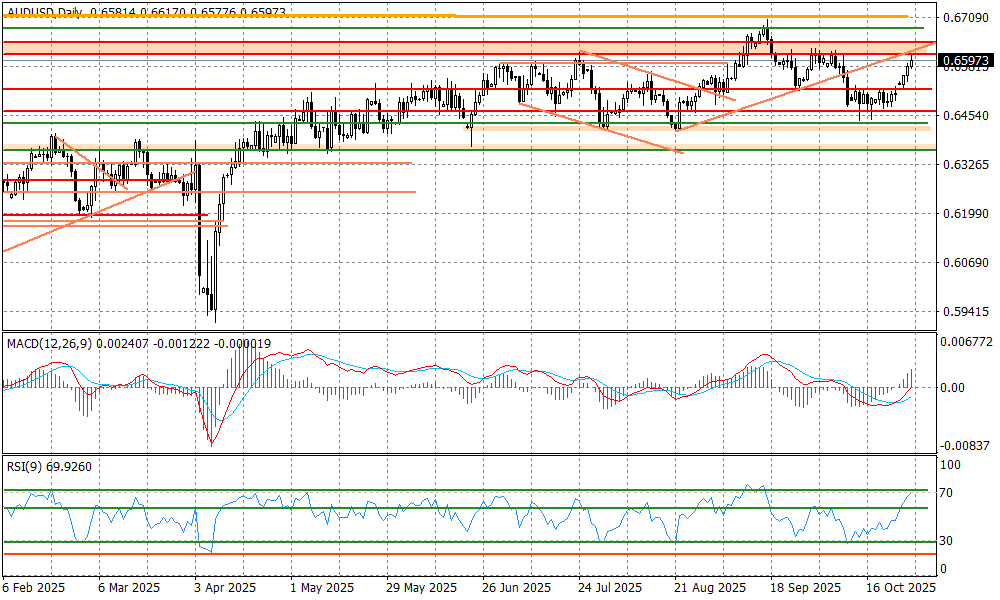 Jeżeli FED da dzisiaj argumenty za rozpoczęciem fali spadkowej przeciwko USD, to zwyżka AUD względem amerykańskiej waluty może być jedną z najwyższych w kolejnych tygodniach (alternatywą może być ewentualnie funt w kontekście problemów fiskalnych Wielkiej Brytanii i cięcia stóp przez BOE). Technicznie na AUDUSD doszliśmy do ważnej strefy oporu przy 0,6615-45, co powoduje, że aby wyjść wyżej, potrzeba będzie mocniejszych argumentów - te może dać dzisiaj FED.