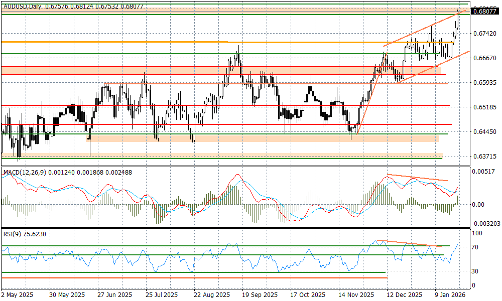 Dzisiejsze dane z rynku pracy w Australii to mocny plus dla oczekiwań tej strony rynku, że RBA pomylił się w zeszłym roku obniżając stopy procentowe i teraz będzie zmuszony je podnosić. Oczekiwania, co do ruchu o 25 punktów baz. w górę na posiedzeniu w końcu lutego skoczyły do 58 proc., ale to wystarczyło do tego, aby AUDUSD kontynuował dynamiczny marsz w górę z ostatnich dni.