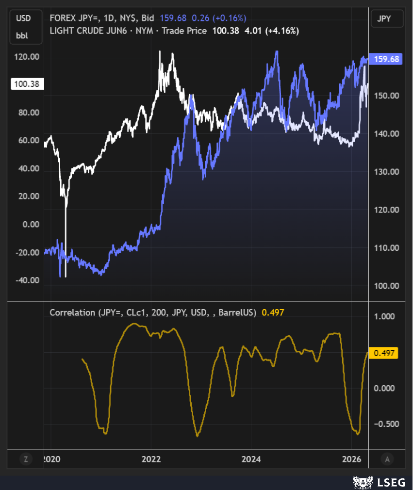 Wykres dzienny USDJPY i kontraktów na ropę WTI - źródło LSEG Workspace