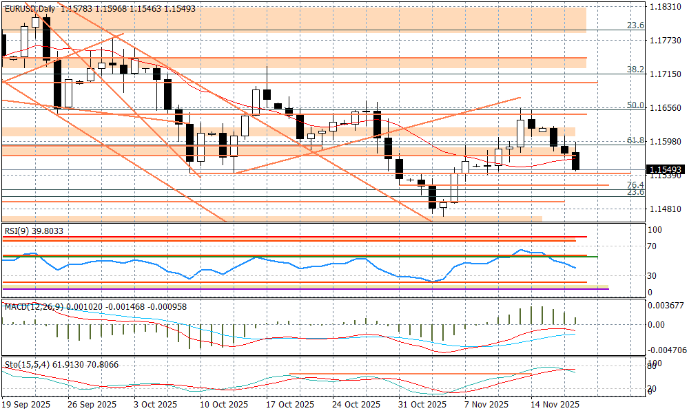 Przypomnijmy - godz. 20:00 zapiski z październikowego posiedzenia FED, które dla jednych mogą być już historią (wszak ostatnio wielu członków FED dało do zrozumienia, że w grudniu najprawdopodobniej dojdzie do pauzy w cyklu obniżek), ale dla innych nie (analizowana będzie chociażby kwestia szczegółów zakończenia QT) i dalej chwilę po godz. 22:00, kiedy to wyniki finansowe opublikuje ciężka liga indeksów na Wall Street, czyli NVIDIA. Na kilka godzin przed tymi publikacjami dolar kontynuuje nieznaczne podbicie. Para EURUSD zbliża się do ważnych wsparć przy 1,1541, o których była mowa w rannym wpisie.
