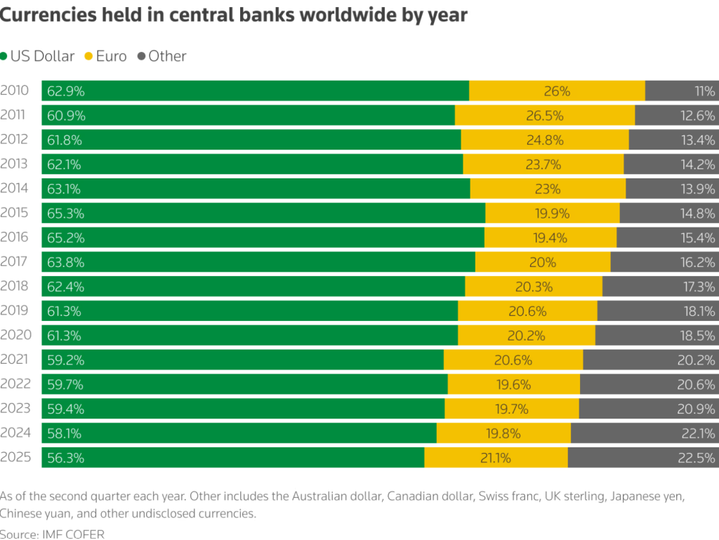 Według ostatnich danych MFW udział amerykańskiego dolara w rezerwach banków centralnych nadal spada - to 56,3 proc. ogółem w II kwartale 2025 r. Wzrosło znaczenie euro (udział na poziomie 21,3 proc. jest najwyższy od 2014 r.), potwierdzając swoją rolę jako waluty numer dwa. To wynik kryzysu wizerunkowego USA za rządów Trumpa i efekt poszukiwania przez inwestorów zamiennika wobec dolara. Nieznacznie, bo o 0,03 proc. wzrosły udziały dolara australijskiego i chińskiego juana, które przekraczają 2 proc. każdy. Uwagę zwraca status juana, który pokazuje, że ambitne plany Pekinu, co do wzrostu znaczenia własnej waluty w zestawieniu z rzeczywistością, nadal pozostają mrzonką.