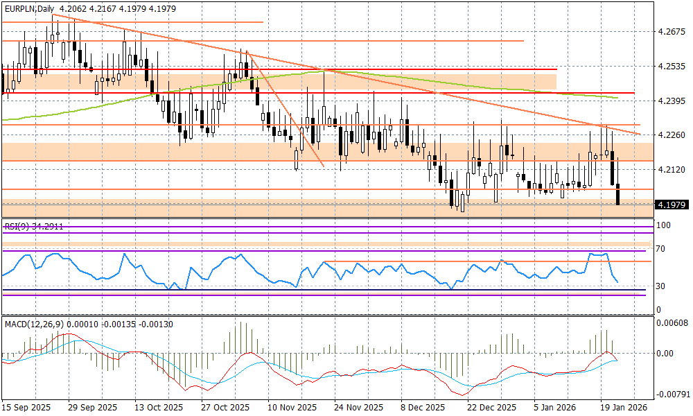 Para EURPLN flirtuje z poziomem 4,20, czyli ponad 2 grosze niższym względem poziomów sprzed przemówienia Trumpa w Davos (miało miejsce w środę o godz. 14:30). Dzisiaj wsparciem dla złotego są dane GUS, jakie napłynęły przed południem - rynek zwrócił uwagę zwłaszcza na przyspieszenie dynamiki płac w grudniu do 8,6 proc. r/r, oraz odbicie w dynamice produkcji budowlano-montażowej (do 4,5 proc. r/r) - co może sugerować, że RPP będzie bardziej skłonna zaczekać z kolejną obniżką stóp procentowych, co oznaczałoby utrzymanie wyższych, realnych stóp procentowych przez dłuższy czas.
