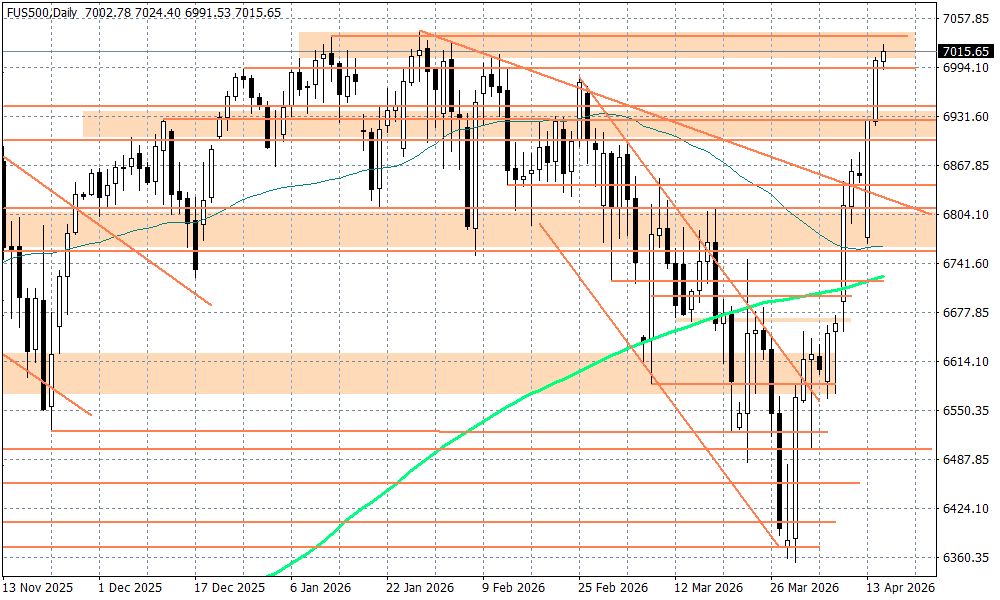 Kontrakt na S&P500 zbliża się do tegorocznego szczytu przy 7042 pkt., który może zostać przetestowany. Tym samym na wykresie zostanie całkowicie wymazany wpływ wojny na Bliskim Wschodzie, choć ta nie została jeszcze formalnie zakończona - jutro ma odbyć się kolejna runda negocjacji USA-Iran. Nie jest jednak pewne, na ile uda się zawrzeć porozumienie do najbliższej środy, kiedy to teoretycznie wygasa 2-tygodniowy rozejm (choć Donald Trump stwierdził wczoraj, że wojna się skończyła). Ewentualne perturbacje związane z tymi rozmowami mogą chwilowo zaważyć na notowaniach S&P500, choć widać, że rynki akcji znów wpadły w amok publikacji wyników kwartalnych spółek, które znów są niezłe (więc rynek szybko "wyrównuje" ostatnią nierównowagę będącą wynikiem irańskiego konfliktu).