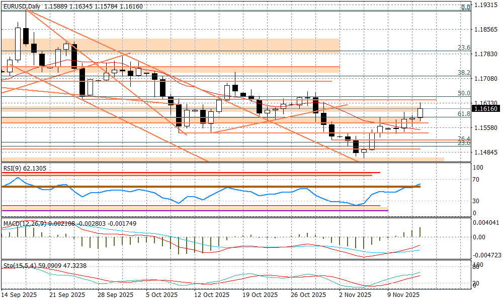 Sytuacja widoczna teraz w porównaniu z tą o poranku jest zgoła inna. Amerykańska waluta słabnie na szerokim rynku, co może wskazywać, że wbrew komentarzom członków FED, inwestorzy liczą jednak na to, że opóźnione dane makro, jakie zaczną spływać po shutdownie, znów podbiją prawdopodobieństwo grudniowej obniżki stóp. Cały czas mamy też wątek związany z obawami, co do wyroku SCOTUS na temat legalności ceł Trumpa - chaos z tym związany może osłabić dolara.