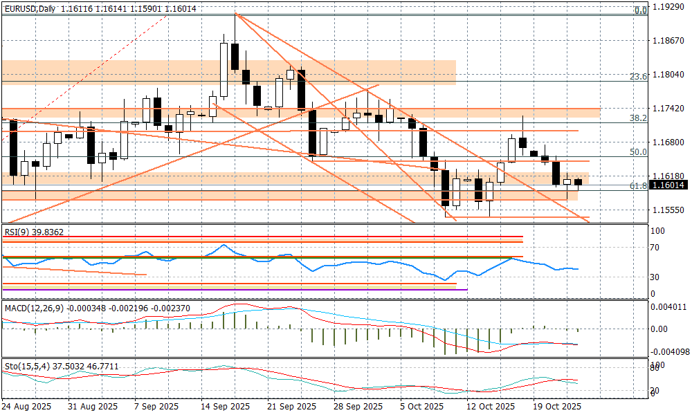 Wczoraj byliśmy świadkami utworzenia formacji doji i tym samym podbicia znaczenia wsparcia przy 1,1572, które bazuje na dawnym szczycie z kwietnia b.r. Dzisiaj rynek EURUSD kręci się wokół 1,16, a inwestorzy zdają się zerkać też na inne klasy aktywów, szukając odpowiedzi na pytanie, czy dolar jeszcze pójdzie w górę na szerokim rynku. Pewnym wsparciem jest nasilenie się wypowiedzi amerykańskich polityków, co do możliwego końca goverment shutdown, a także plotki, co do przyszłotygodniowego spotkania Trump-Xi. Może być ono trudne, stąd też niepowodzenie będzie oznaczać zaostrzenie wojny handlowej i zaszkodzi dolarowi. Swoje zrobi też FED, który planowo obniży stopy procentowe na posiedzeniu w przyszłym tygodniu i zostawi otwartą furtkę do takiego ruchu w grudniu.