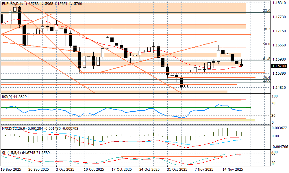 Para EURUSD zeszła wczoraj poniżej bariery 1,16 i dzisiaj ruch ten jest kontynuowany. Ruch spadkowy się pogłębia, co zdaje się sugerować test ważnego wsparcia przy 1,1541 jeszcze dzisiaj. Wieczorem na tapecie mocno cenotwórcze dla rynków informacje (minutes FED o godz. 20:00 i zyski NVIDIA o godz. 22:00). W tle mamy też przytaczane w głównym komentarzu wątki wyboru następcy szefa FED, oraz legalności ceł Trumpa, które będą oddziaływać w średnim terminie (kilku tygodni). W nieco krótszym okresie podbić może też wątek potencjalnej interwencji USA w Wenezueli i możliwych reakcji na rynku ropy - jej podbicie wpłynie na percepcję ruchów FED w styczniu (bo grudzień zdaje się być już rozegrany).