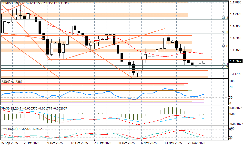 Widoczny wczoraj brak sił na trwalsze wyjście ponad techniczny opór przy 1,1541, sygnalizuje nieco dłuższą konsolidację w zakresach powyżej kluczowych okolic 1,15. Para EURUSD czeka na mocniejsze impulsy. Opublikowane rano dane nt. niemieckiego PKB za III kwartał (finalnie 0,3 proc. r/r) to za mało, istotniejsze dane mamy po południu z USA, w tym wyliczenia Conference Board o godz. 16:00. Niemniej brak mocniejszej reakcji na ostatnie skoki oczekiwań, co do grudniowej obniżki stóp przez FED, pokazuje, że rynek bardziej czeka na wyjaśnienia kwestii zakończenia programu QT z początkiem grudnia.