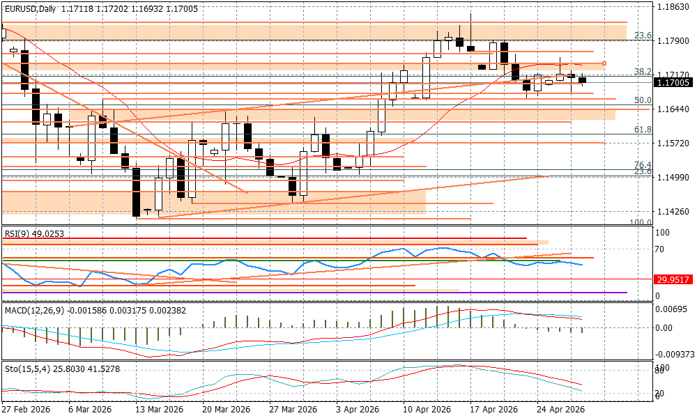 Para EURUSD wybroniła się wczoraj przed spadkiem i dalej pozostajemy wokół 1,17. Dzisiaj kluczowe będą wieczorne doniesienia z FED - nieco bardziej "jastrzębi" przekaz od Jerome Powella może doprowadzić do wybicia wczorajszego dołka przy 1,1676 i testu okolic wsparcia przy 1,1665. Te może być nawet naruszone (kolejny ważny poziom to okolice 1,1640), jeżeli dzisiaj wieczorem pojawi się większa zmienność. Wpływ na nastroje będą mieć fluktuacje na Wall Street po publikacji wyników czterech big-techów z Mag-7.