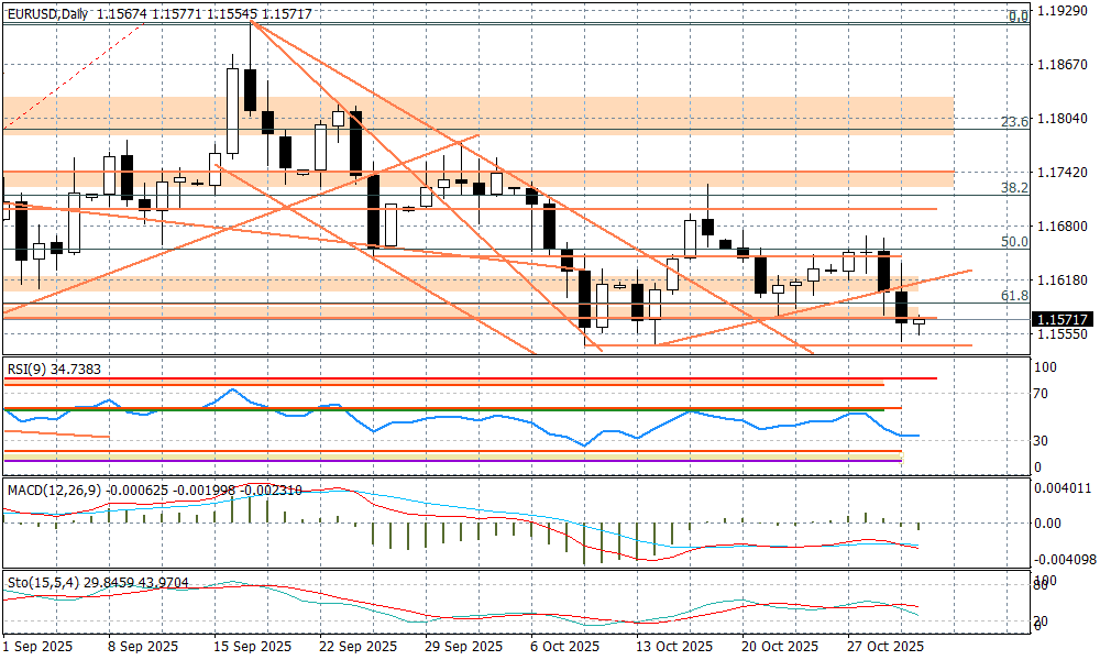 Okolice 1,1540 na EURUSD to ważne wsparcie, które już sprawdziło się w październiku. Podobnie było wczoraj, kiedy EURUSD potaniał na fali ruchu dolara na szerokim rynku będącego jeszcze echem komentarza Jerome Powella ze środy, że grudniowa obniżka stóp jest pod znakiem zapytania. Piątek przynosi próbę odbicia EURUSD, choć brak istotnych publikacji w kalendarzu, oraz koniec tygodnia i miesiąca może bardziej sprzyjać "dryfowaniu" kursu do końca sesji.