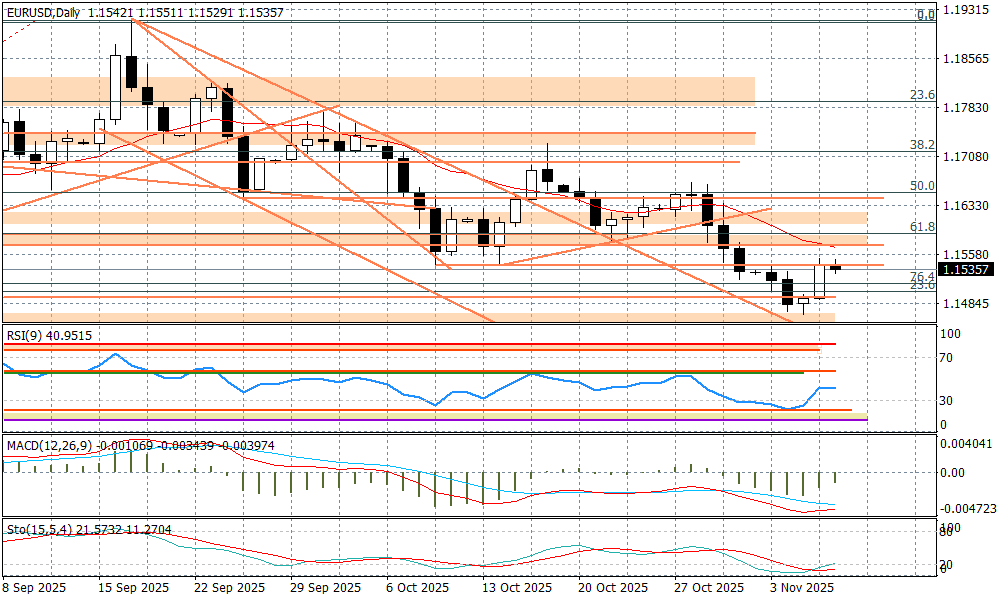 Odbicie EURUSD widoczne wczoraj doprowadziło do prób naruszenia oporu przy 1,1541, jaki bazuje na minimum z 9 października. Krótkoterminowy szczyt wypadł przy 1,1552, a w kolejnych godzinach rynek nieco się cofnął. Korekta pozostaje jednak relatywnie płytka, co może wskazywać na chęci wyjścia wyżej, co sugerowałoby potencjalną zmianę średnioterminowego układu na wzrostowy, zwłaszcza, gdyby doszło do mocnego wybicia ponad poziom 1,16.