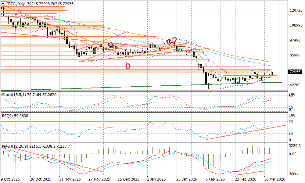 Technicznie - czekamy na wybicie kluczowych 74 tys. USD - wokół tego poziomu jest zbudowany mocny opór. Wyjście powyżej dałoby silny impuls do korekty całego ruchu korekcyjnego od października ub.r. do lutego b.r. Triggerem do tego ruchu może być odreagowanie na globalnych rynkach w sytuacji, kiedy pojawiłyby się negocjacje zmierzające do zamrożenia wojny w Iranie.