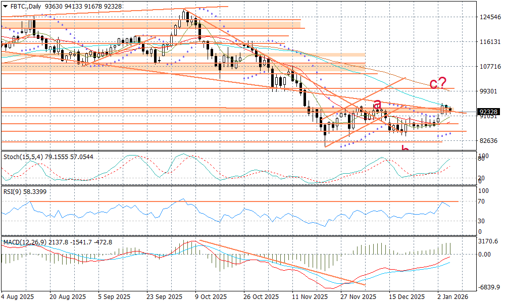 Wczoraj i dzisiaj kontrakt na bitcoina koryguje zwyżkę, która była widoczna na sesji 2 i 5 stycznia i doprowadziła do przetestowania szczytów z połowy grudnia przy 94900 USD. Jeżeli chodzi o techniczne aspekty to plan minimum dla korekty a-b-c został zrealizowany - fala c dotarła do wysokości fali a. Nie jest, zatem powiedziane, że fala a ma być równa fali c, co oznaczałoby podejście pod poziom 100000 USD. Widać, że sentyment wokół krypto jest mocno zależny od tego jak zachowują się spółki technologiczne na Wall Street, a tu wczoraj widać było pierwsze sygnały wyczerpywania się noworocznego optymizmu, chociaż indeks Nasdaq wyrysował białą świecę wzrostową.