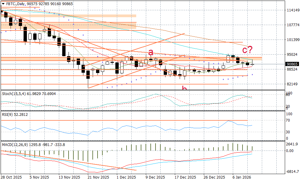 Napięcia globalne i te wokół FED, nie sprzyjają popytowi na ryzykowne aktywa. Uwagę zwraca podażowy charakter handlu na futures na S&P500 dzisiaj, co również rzutuje na sentyment wokół kryptowalut. Tymczasem futures na bitcoina ugrzęzły nieco powyżej kluczowego wsparcia przy 90000 USD. Jego silniejsze naruszenie będzie sygnalizować, że struktura korekcyjna a-b-c została zakończona i wracamy do spadków, nawet z celem w rejon kluczowego wsparcia z lat 2024-25, czyli okolic 74500 USD.
