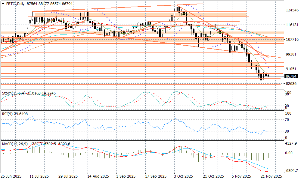 Futures na bitcoina nieco odreagował po ostatnich silnych spadkach, ale mniej niż by teoretycznie mógł, jeżeli popatrzymy na skalę odbicia na akcjach z Wall Street. Powrót lepszego sentymentu w połączeniem z ponownymi oczekiwaniami na cięcie stóp przez FED na posiedzeniu 10 grudnia, mogą być argumentami za kontynuacją odbicia na BTC. Niemniej wiele na to wygląda, że będzie to tylko odbicie, a nie początek nowej fali wzrostowej, która wyprowadzi nas ponad ostatni szczyt z października przy 125 tys. USD.