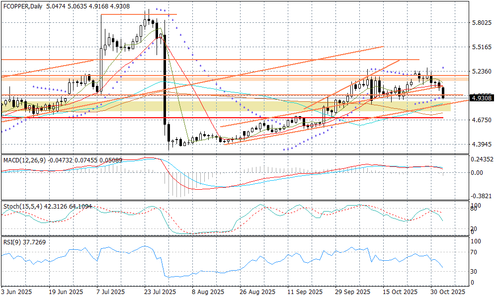 Kontrakty na miedź tanieją mocniej od poczatku tygodnia, a wpływ na to mają słabsze dane PMI z Chin, które stawiają w wątpliwość tezy o dobrej kondycji tamtejszej gospodarki. Chociaż podaż surowca na rynku może być nadal mniejsza (kluczowe kopalnie Glencore i Anglo America podały, że wydobycie miedzi w tym roku było mniejsze), a globalny popyt w perspektywie nadchodzących lat będzie dalej rósł za sprawą rewolucji wokół AI, o tyle w krótkim okresie duży wpływ na korektę na surowcach może mieć silny dolar.