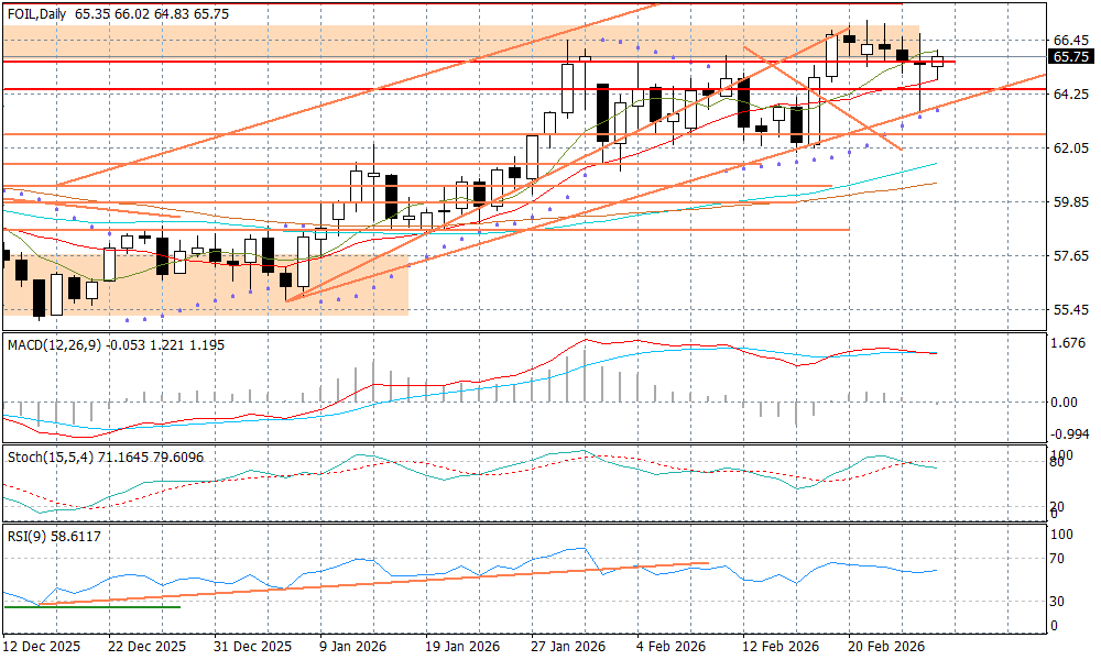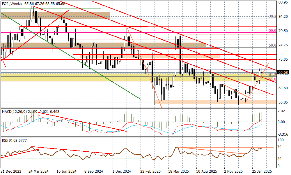 Wczorajsze naruszenie wsparcia na kontraktach na ropę WTI przy 64,50 USD było krótkotrwałe, a test rejonu 63,50 USD tylko podbił znaczenie dwumiesięcznej linii trendu. Układ techniczny pozostaje pozytywny, choć dopiero wybicie ostatnich maksimów przy 67,26 USD będzie potwierdzeniem kontynuacji ruchu rozpoczętego w pierwszych dniach stycznia b.r.