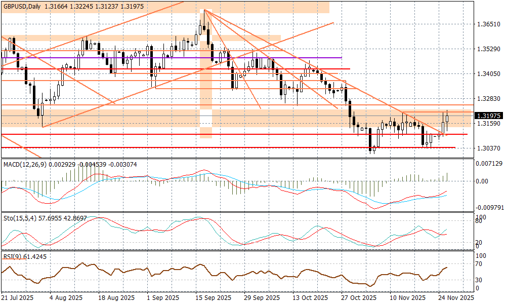 Para GBPUSD wybiła się ponad poziom 1,32, chociaż naruszenie szczytu z 13 listopada przy 1,3215 okazało się na razie nietrwałe. Teraz więcej może zależeć od tego, co pokaże dolar na szerokim rynku. Potwierdziło się to, na co zwracałem uwagę rano - funt zareaguje pozytywnie, jeżeli kanclerz Reeves zachowa się odpowiedzialnie i przedstawi wiarygodny program działań zmierzający do ogarnięcia trudnej sytuacji w finansach publicznych. Kwestia mocniejszego dociśnięcia w polityce fiskalnej i jej przełożenie na być może większe luzowanie monetarne przez BOE w przyszłym roku, zeszła na bok.