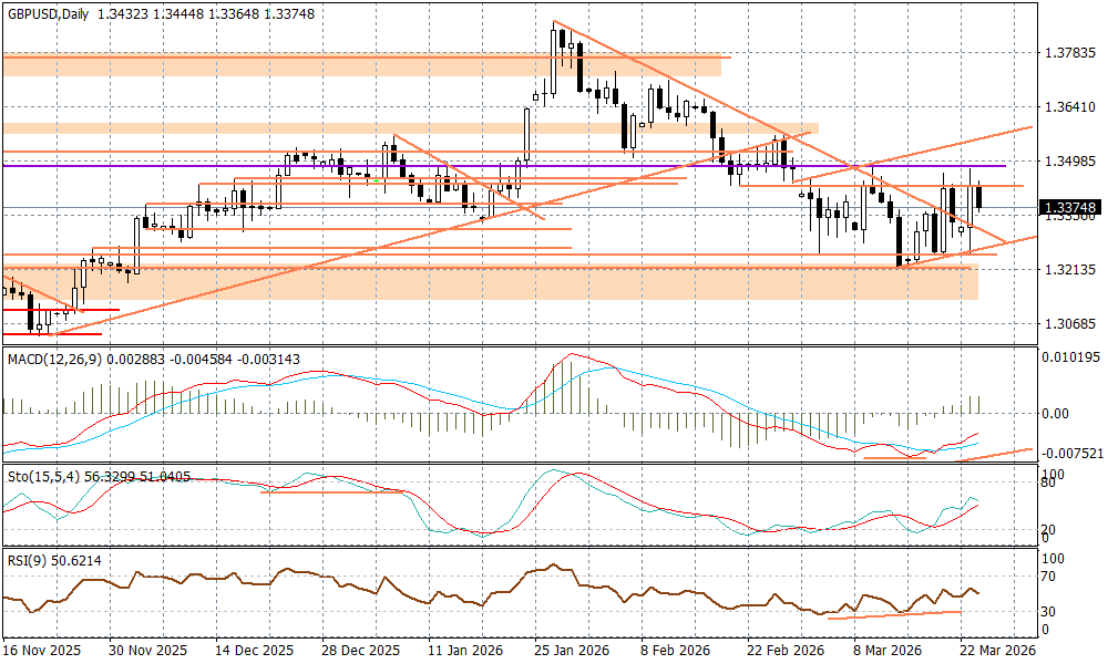 Sytuacja na parze GBPUSD jest podobna do tej na innych ujęciach z USD - za spore wahania odpowiedzialny jest prezydent Donald Trump, który próbuje zarządzać oczekiwaniami, co do zakończenia konfliktu w Iranie. Opublikowane dzisiaj rano szacunki indeksów PMI z Wielkiej Brytanii za marzec, wypadły podobnie do tych ze strefy euro - zaskakująco niezły przemysł (51,4 pkt.) i gorsze usługi (51,2 pkt.). Rynek wycenia podwyżkę stóp o 25 punktów baz. przez BOE już 30 kwietnia na 75 proc.