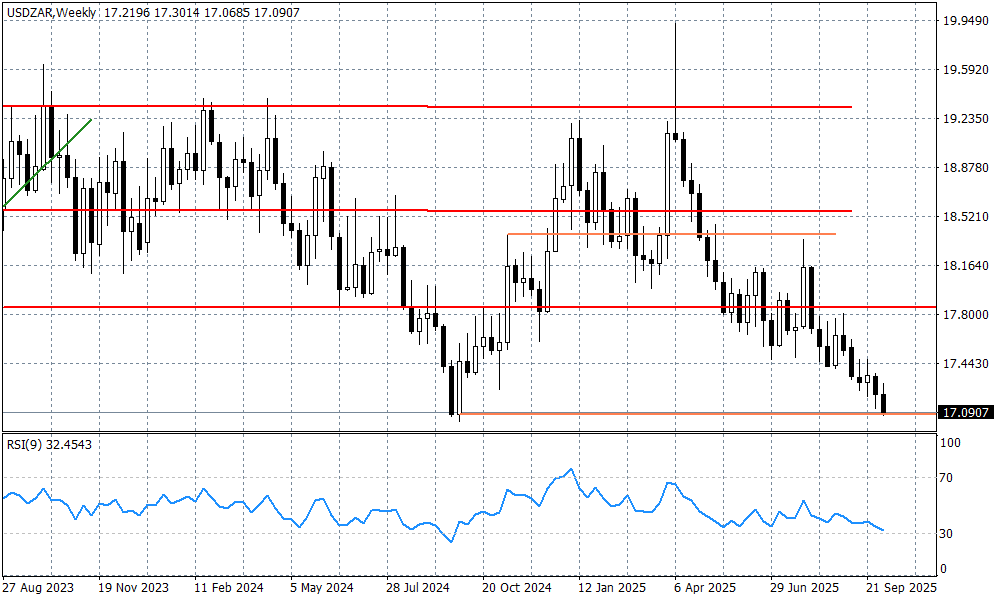 Silny dolar? Nie w przypadku USDZAR. Południowoafrykańska waluta nadal wygrywa, co widać po poniższym wykresie tygodniowym. Wsparciem jest hossa na surowcach, zwłaszcza na złocie, którego RPA jest producentem. Do tego dochodzi pozytywna różnica w stopach procentowych pomiędzy SARB, a FED, jeżeli uwzględnimy spodziewane cięcia stóp przez FED jeszcze w tym roku.